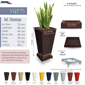 Modelo: VQF75 Altura: 75 cm Largura: 40 cm Base: 24 cm Peso: 3.7 kg Capacidade: 80 litros Material: polietileno ................................................................................................................................................... Grandes vantagens do polietileno