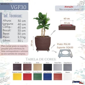 Anúncio válido para 1 um vaso quadrado de resina de polietileno para plantas naturais e artificiais. Não acompanha prato, plantas e nem suporte.Vaso com largura maior para plantas de pequeno a médio porte, que necessitam de espaço para desenvolvimento. Destaca-se pela delicadeza e leveza, ideal para decoração, o design e a textura oferecem elegância e beleza, transformando seu ambiente.Modelo VGF30Medidas técnicas:Altura: 30 cm; largura: 40 cm; base: 30 cm; peso: 2,2 kg / 35 lGrandes vantagens do polietilenoGrande durabilidade, resistência e leveza;Podem ficar expostos ao sol, chuva, poeira e maresias;Podem ser mantidos em contato permanente com o solo;Impermeáveis e laváveis;Não proliferam fungos e bactérias;Não mofam e não ressecam; Não soltam farpas ou rachaduras;Não desbotam;Não necessitam de manutenção;Possuem proteção contra raios ultra-violeta uv ;Duram mais que concreto, cerâmica, fibra e outros;