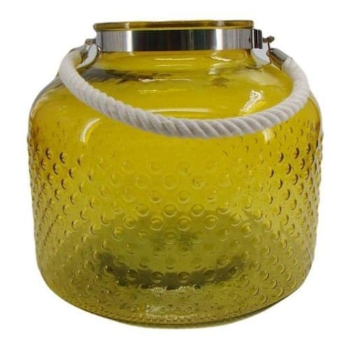 O Vaso de vidro decorativo com alça de corda trançada é perfeito para decorar seu ambiente, seja para suas flores preferidas ou simplesmente como uma peça decorativa. Confeccionado em vidro grosso, no tom amarelo.