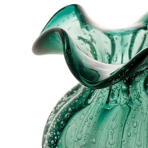 O vaso decorativo em Vidro Murano é ideal para acomodar arranjos florais, plantas de pequeno porte ou como peça de destaque individual. A técnica de produção artesanal, com vidro soprado, resulta em um objeto único, com variações sutis que atestam sua autenticidade. O acabamento translúcido esmeralda permite a passagem de luz, valorizando a cor e as texturas, enquanto as bolhas internas proporcionam um efeito visual diferenciado.