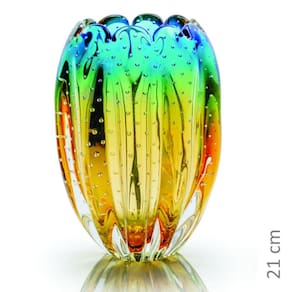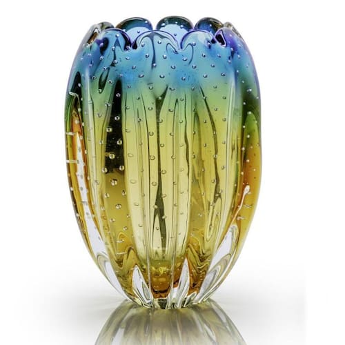 Vaso Em Cristal Murano Água Marinha E Âmbar São Marcos 21cm Vaso Em Cristal Murano Água Marinha E Âmbar - São Marcos é uma peça decorativa produzida 100% artesanalmente com a técnica secular e originária da Itália, a qual com muita maestria e criatividade são desenvolvidas e preservadas no brasil pela Cristais São Marcos desde 1962.