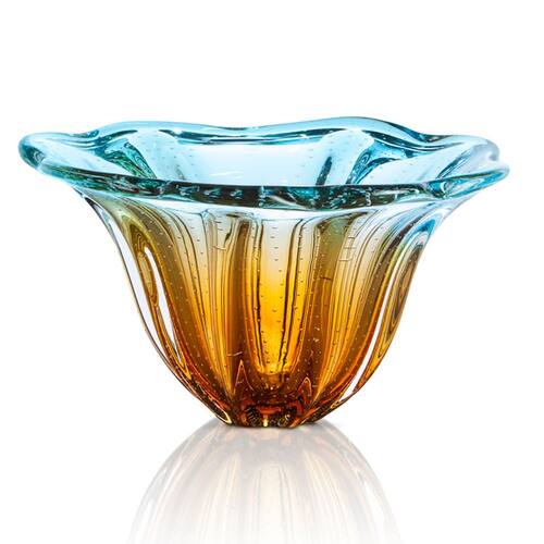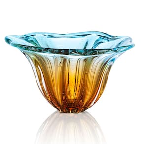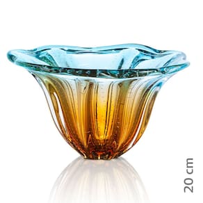 Vaso Em Cristal Murano agua Marinha E Ambar São Marcos Comprimento:36cm Largura:36cm Altura:20cm Peso:5640g Produzida 100% artesanalmente com a técnica secular e originária da Itália, a qual com muita maestria e criatividade são desenvolvidas e preservadas no Brasil pela Cristais São Marcos desde 1962. As escolhas das peças são versáteis e podem ser usadas para decorar casas e ambientes dos mais variados estilos. A tradição do Cristal Murano e a inovação em detalhes, formas e cores, trazem requinte para a decoração. O colorido do Muranoem especial, torna-se um coringa na decoração e produzem um efeito muito bonito em locais com luz natural, não dependendo de nenhum outro elemento para se destacar. As peças em Cristal Murano, são atemporais, aposte nelas como a estrela da decoração ou ainda para harmonizar em combinações com diferentes artigos para compor um ambiente. Junto com as peças em Murano, leve ainda um pouco de história. Uma dica é misturar diferentes Muranos e criar sua coleção de arte particular. O cristal Murano, tornou-se objeto de desejo por suas características únicas. Sendo assim, com todas essas particularidades, ele é uma ótima escolha para decorar, colecionar e ainda presentear com classe e sofisticação.
