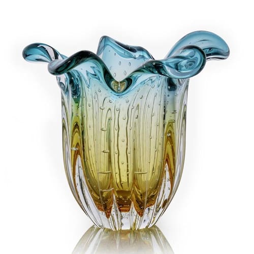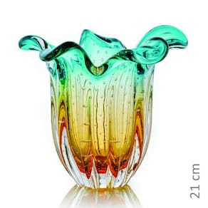 Vaso Em Cristal Murano Esmeralda E Âmbar - São Marcos 22cm Vaso Em Cristal Murano Esmeralda E Âmbar - São Marcos é uma peça decorativa produzida 100% artesanalmente com a técnica secular e originária da Itália, a qual com muita maestria e criatividade são desenvolvidas e preservadas no brasil pela Cristais São Marcos desde 1962.