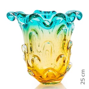 Vaso Em Cristal Murano Esmeralda E Ambar São Marcos Comprimento:24cm Largura:24cm Altura:25cm Peso:6500g Produzida 100% artesanalmente com a técnica secular e originária da Itália, a qual com muita maestria e criatividade são desenvolvidas e preservadas no Brasil pela Cristais São Marcos desde 1962. As escolhas das peças são versáteis e podem ser usadas para decorar casas e ambientes dos mais variados estilos. A tradição do Cristal Murano e a inovação em detalhes, formas e cores, trazem requinte para a decoração. O colorido do Muranoem especial, tornase um coringa na decoração e produzem um efeito muito bonito em locais com luz natural, não dependendo de nenhum outro elemento para se destacar. As peças em Cristal Murano, são atemporais, aposte nelas como a estrela da decoração ou ainda para harmonizar em combinações com diferentes artigos para compor um ambiente. Junto com as peças em Murano, leve ainda um pouco de história. Uma dica é misturar diferentes Muranos e criar sua coleção de arte particular. O cristal Murano, tornouse objeto de desejo por suas caracteristicas únicas. Sendo assim, com todas essas particularidades, ele é uma ótima escolha para decorar, colecionar e ainda presentear com classe e sofisticação.