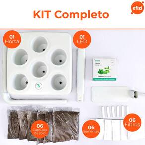 Acompanha: 1 Vaso Horta Autoirrigável Inteligente com LED Branco Brota 6 Saquinhos com sementes selecionadas 6 Cápsulas de solo inteligente