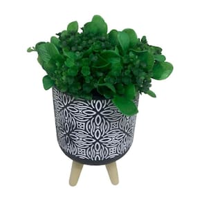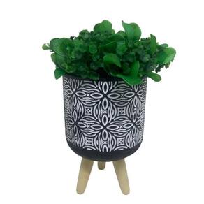 Vaso mosaico de cerâmica branco e preto com tripé de madeira e planta artificial.