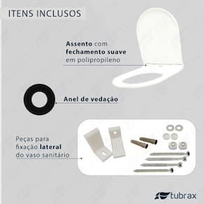 - Conteúdo da embalagem: 1 Vaso sanitário convencional com suas peças de fixação; 1 Assento com sistema Anti-Ruído; 1 anel de vedação