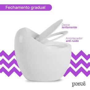 Outro diferencial é a tampa com queda amortecida, que evita ruídos e aumenta a durabilidade do assento. A estrutura robusta e a cerâmica de alta qualidade asseguram resistência, estabilidade e longa vida útil, reforçando o compromisso da Porcê com qualidade e funcionalidade.