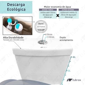 Na Tubrax, nos preocupamos com o meio ambiente, e por isso o VAB0026 possui um sistema de descarga ecológica com duplo comando. Enquanto os modelos convencionais podem utilizar até 12 litros de água por descarga, o modelo VAB0026 consome apenas 3 litros (descarga curta) ou 6 litros (descarga longa). Isso ajuda a economizar água sem comprometer a eficiência da descarga.