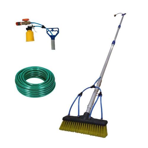 Contém: - vassoura com cerdas exclusivas - mangueira e conectores - cabo telescópico de 6 metros - mangueira de 20m - válvula abre e fecha - dispenser sabão