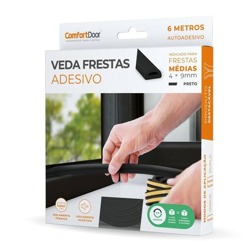 Veda Frestas Adesivo O Veda Frestas Adesivo proporciona alto nível em vedação de frestas de batentes de portas, janelas, esquadrias e armários com rapidez e praticidade. Esta é a solução para quem busca isolamento acústico, amortecimento de batidas, proteção contra a entrada de vento, poeira, insetos, umidade e água. Fácil de instalar, o Veda Frestas Adesivo é ideal para todos os tipos de superfícies e pode ser fracionado de acordo com a necessidade e local de aplicação. A medida de largura desse produto é igual a medida padrão de rebaixo de batente, que é 9mm, sendo assim, só é necessário escolher dentre as três alturas a que melhor se encaixa no tamanho da fresta e a cor que mais combina com a superfície de instalação. VANTAGENS: Isolamento Térmico Isolamento Acústico Evita a entrada de poeira e umidade Evita a passagem de insetos Material: Borracha EPDM Medidas: 4x9 mm Ajuste máximo de corte: Sem restrição Tipos de porta/janela: Qualquer modelo de porta e janela : 1 um ano contra defeitos de fabricação de acordo com os termos de . Instalação: 1 - Retire o Veda Frestas de sua embalagem. 2 - Limpe toda a superfície onde será aplicado o Veda Fresta, verificando se está completamente limpa e seca. 3 - Destacar o rolo em duas partes. 4 - Medir toda a superfície a ser aplicado com o auxílio de uma trena e cortar o Veda Fresta de acordo com as Medidas obtidas. 5 - Remover a proteção do adesivo e aplicar o Veda Fresta na superfície desejada, conforme as imagens abaixo Conteúdo da embalagem: 1 um rolo duplo de borracha autoadesiva com 3 três metros de comprimento 6 m após a sua divisão