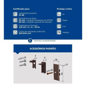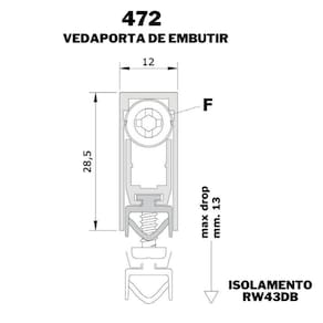 Cor: Alumínio Cinza Dimensões: 28,5 mm altura e 12 mm largura Medida: 93 cm Ajustes: até 20 cm em seu comprimento Espessura Máxima do Vão Inferior: 1,3 cm Tipos de Porta: Madeira, Metal e PVC. dobradiças ou Pivotantes Certificação: Funcionamento de 200.000 Ciclos Vazão de Ar: 0,4m3/ h.M2 - Redução de 90% Índice de Redução Sonora 43 dB Isolamento: RW43DB