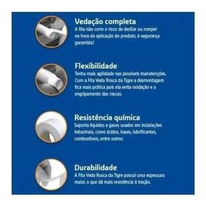Vedação completa, fácil de aplicar. A Fita Veda Rosca Tigre é Utilizado para vedar juntas roscáveis PVC, CPVC ou metal , tanto para instalações de água fria como quente. Fácil de aplicar, ideal para eliminar as folgas existentes entre as roscas. Aplique 10 voltas no sentido horário. Marca: Não Informado Ean: 79045429277916
