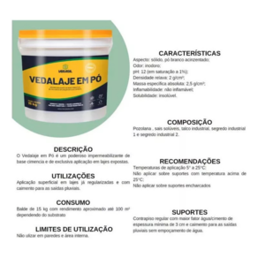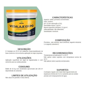 Produto de uso externo indicado para impermeabilização superficial de lajes já regularizadas e com caimento adequado para escoamento de água. O Vedalaje em Pó é uma solução prática e de fácil aplicação em áreas expostas, contribuindo para a durabilidade das estruturas.