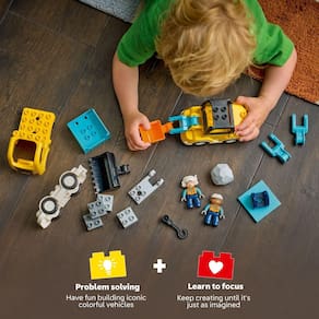LEGO DUPLO Ciudad 3 en 1 Vehículos de Construcción para Niños Pequeños - Set de Juego de Aprendizaje y Ficción para Niños y Niñas, Edad 2+ - Bloques para Practicar Habilidades Motrices Finas - Regalo para Cumpleaños - 10475 - CONSTRUYE Y RECONSTRUYE – El juguete LEGO DUPLO Ciudad 3 en 1 Vehículos de Construcción (10475) para niños y niñas a partir de 2 años permite a los pequeños armar 6 diferentes juguetes de camiones de construcción. - 6 VEHÍCULOS INCLUIDOS – Los bloques se ensamblan para crear 2 grúas con ganchos diferentes, una cargadora, una plataforma elevadora de tijera, un volquete o una excavadora con brazo flexible. - FOMENTA EL JUEGO SIMBÓLICO CREATIVO – Incluye 2 figuras de constructores que los niños usan para conducir, dirigir y operar los vehículos para completar el trabajo. - PRACTICA HABILIDADES MOTRICES FINAS – Este juguete didáctico para niños fomenta que los pequeños se enfoquen y descubran cómo combinar las funciones de los camiones de construcción para encontrar nuevas formas de jugar. - REGALO PARA NIÑOS EN EDAD PREESCOLAR – Un regalo considerado para cumpleaños u ocasiones especiales para niños y niñas que disfrutan de juguetes de construcción y sets de vehículos. - EXPLORA EL MUNDO A TRAVÉS DEL JUEGO – Los juguetes LEGO DUPLO incluyen características divertidas, situaciones familiares y personajes diversos para ayudar a los pequeños constructores a comprender el entorno que los rodea. - DIMENSIONES – Este juguete de construcción de 22 piezas incluye una excavadora que mide más de 11 cm de alto, 22 cm de largo y 7 cm de ancho.