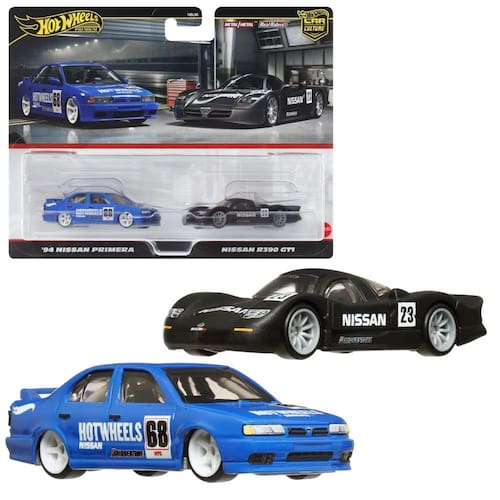 Pacote com 2 unidades Hot Wheels HRR74 Premium Nissan R390 GT1/94 Nissan Primera Vehicle Toy Minicar, 3 anos, azul/preto