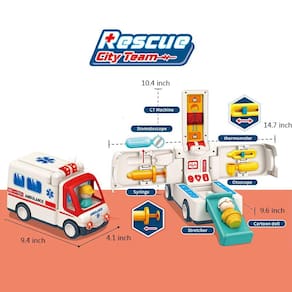 -?Vários brinquedos de ambulância?Abra o carro e inclua: seringas, telescópios orais, otoscópios, termômetros e um paciente deitado no carro. Ensine as crianças a aprender as funções, usar métodos e conhecimentos médicos de vários dispositivos médicos. Este é o melhor kit médico precoce para crianças.