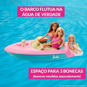 Veículo e Boneca - Barbie - Barco que Flutua na Água - Mattel: a imaginação pode levar suas histórias da terra para o mar com a boneca Barbie, seu cachorrinho de estimação e um barco que flutua de verdade na água. Com recursos divertidos, um design colorido e espaço para três bonecas, as crianças podem carregar a lancha da Barbie e levá-la em todos os tipos de aventuras. Coloque o colete salva-vidas na boneca Barbie e passeie pelas ondas, depois ancore o barco para relaxar com porta-copos plug-and-play e acessórios Detalhes: • Detalhes autênticos e realistas • O barco da Barbie flutua na água • Boneca articulada para poses mais realistas • Espaço para três bonecas Barbie (bonecas vendidas separadamente) INFORMAÇÕES: • Produto: Barco de Luxo com Boneca Barbie • Marca: Mattel • Coleção: Barbie • Linha: Playsets e Veículos Barbie • Tipo: Barco de brinquedo que flutua na água • Categoria: Carrinhos e Cia / Barcos e Navios • Tamanho (C x A x L): 45 x 08 x 15.5 cm • Conteúdo: 1 Boneca, 1 lancha, 1 figura de cachorrinho, 1 colete salva vidas e acessórios extras • Recomendação: para crianças a partir de 03 anos de idade ESPECIFICAÇÕES: • Modelo: Barco com Boneca Barbie • Referência: GRG30 • Código de Barras: 887961903560 • Embalagem (C x A x L): 38 x 23.5 x 19.5 cm • Embalagem (Peso): 1.14 kg • Material / Composição: Plástico • Registro: 005987/2021 • Certificado: Órgãos Autorizados - OCP´S (Organismos de Certificação de Produtos) BENEFÍCIOS DE BRINCAR: • Eleva a autoestima • Exercita a memória • Estimula o raciocínio • Exercita o imaginário • Desenvolve a criatividade • Desenvolve percepção visual • Desperta a atenção e curiosidade • Desenvolvimento neuropsicológico • Estimula habilidades motoras básicas • Incentiva a comunicação e linguagem • Desenvolve aspectos emocionais e afetivo • Estimula o reconhecimento de formas e cores AVISO: • As imagens são meramente ilustrativas • Os pesos, tamanhos e medidas são aproximados • As cores e estampas dos produtos podem ter variações • As informações são de responsabilidade do fabricante ou fornecedor
