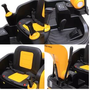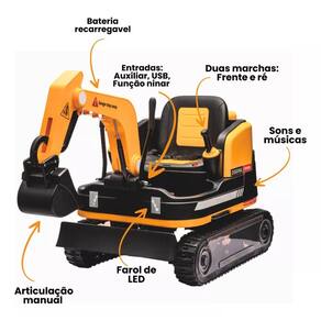 Motor elétrico de 12V para movimentos realistas. Controle remoto para controle total pelos pais. Movimento para frente e para trás com dois níveis de velocidade. Braço escavador com articulação manual. Faróis de LED e sons realistas. Entrada Auxiliar, USB e função de música. Bateria recarregável com até 2 horas de autonomia.