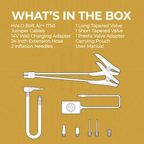 Halo Bolt Air+ 1750 Motor de arranque portátil com compressor de ar, banco de potência, holofote com visor digital carrega vários dispositivos, preto - HALO Bolt Air+ 1750: Chega de baterias de carro mortas ou pneus furados. Dê partida no seu veículo, encha seus pneus e carregue dispositivos alimentados por USB. Tem um holofote integrado, para que você esteja melhor preparado para emergências na estrada e quedas de energia - Início de um empurrão: alimentado com 600 amperes e 1750 amplificadores de pico, você pode iniciar com confiança qualquer bateria de carro, SUV, caminhão ou marinha de 12 volts e é adequado para motores a gasolina de 6L e 3L a diesel. A tecnologia inteligente é incorporada diretamente no design à prova de erros, de modo que os cabos jumper incluídos são à prova de faísca, mantendo você seguro com o que há de mais moderno em bateria inteligente e proteção de carregamento patenteada. O guia de início de salto em 3 etapas é convenientemente impresso diretamente na bolsa de armazenamento de microfibra - Carregamento multidispositivo: possui uma porta USB-C bidirecional que permite recarga rápida, uma porta USB-A e um compressor de ar de 130 PSI. O Bolt Air+ 1750 também funciona como um carregador portátil para recarregar dispositivos alimentados por USB - Voltímetro integrado e holofote integrado: a tela digital colorida extragrande aprimorada é 3,5x o tamanho dos modelos Bolt anteriores. Mostra a tensão, status de carregamento, nível percentual, temperatura alta-baixa e indicador de aviso - Uma linha completa de soluções de carregamento e energia: A HALO fornece a energia que você precisa para tranquilidade com uma linha completa de energia portátil, carregamento rápido sem fio, partida de carro e soluções de energia definitivas
