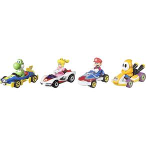 Pacote com 4 veículos Hot Wheels Mario Kart, conjunto de 4 personagens favoritos dos fãs, inclui 1 modelo exclusivo, presente colecionável para crianças e fãs a partir de 3 anos — É uma coleção instantânea com 4 pacotes de réplicas de karts inspirados em personagens da Hot Wheels que dão vida à ação do videogame! - Cada conjunto apresenta 4 veículos fundidos sob pressão em escala 1:64 que funcionam na pista Hot Wheels! - Os karts apresentam personagens favoritos dos fãs com um modelo exclusivo em cada pacote! - É um ótimo presente para fãs, colecionadores e crianças de 3 anos ou mais! - Combine com outros veículos e playsets de Mario Kart da Hot Wheels para subir de nível!
