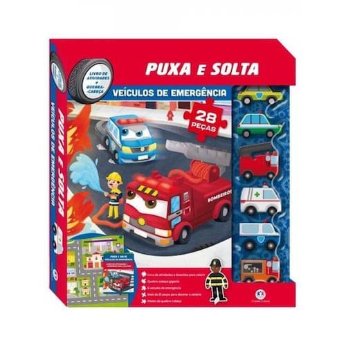 Prepare-se para muitas horas de diversão como box PUXA E SOLTA VEÍCULOS DE EMERGÊNCIA!Para começar a brincadeira, monte oquebra-cabeça e forme uma grande cidade.Em seguida, pegue os seis veículos, puxe e solte-osno cenário para ver todos ganhando velocidade!Deixe o cenário ainda mais divertido, usando aspeças que acompanham o box.Há bombeiros, policiais e muito mais para fazer acidade ganhar vida.Quando terminar a brincadeira, continue sedivertindo com as atividades do livro.