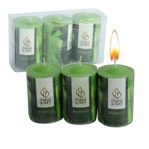 Vela Aromática 40g Cada 3 Peças Bamboo A fragrância bamboo remete ao frescor da natureza, transmitindo paz e tranquilidade; Cultive a serenidade e sua paz de espírito e ao mesmo tempo deixe seu ambiente com uma elegancia e sofisticação natural. Um verdadeiro convite ao bem estar;\nEspecificações: Marca : CHAMA OURO Tipo de material : Parafina perfumada Cores ou Estampa : Verde Dimensões do Produto : 6 X 3,5 X 3,5 CM Dimensões da Embalagem : 6 X 11 X 3,5 CM Peso Bruto (Gramas) : 0.143 Produto 100% nacional; O que vem na Embalagem: 3 Velas Aromáticas