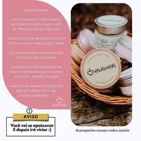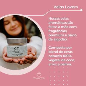 Vela 100% livre de parafina Vegana= não possui em sua composição materiais ou componentes de origem animal. Eco-friendly = amigável ao meio ambiente Cruelty- free = não realiza testes em animais em nenhuma fase da produção Ecológica = preocupa-se em discutir questões que afetam a integração entre os seres e a terra. Biodegradável= são todos aqueles fabricados com materiais rapidamente decompostos no meio ambiente. Marca: Velas Lovers Ean: 7904746911367