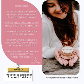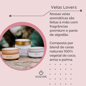 Vela 100% livre de parafina Vegana= não possui em sua composição materiais ou componentes de origem animal. Eco-friendly = amigável ao meio ambiente Cruelty- free = não realiza testes em animais em nenhuma fase da produção Ecológica = preocupa-se em discutir questões que afetam a integração entre os seres e a terra. Biodegradável= são todos aqueles fabricados com materiais rapidamente decompostos no meio ambiente. Marca: Velas Lovers Ean: 7903756599800