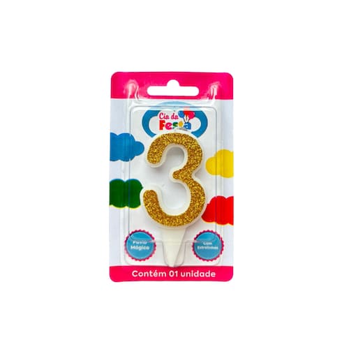 Vela Estilosa Ouro Nº3 Cia da Festa. Celebre cada comemoração com um toque mais sofisticado usando a vela Estilosa! Disponível em números que brilham com glitter, esta vela realça qualquer bolo com seu design elegante e cor chamativa. Seu pavio especial cria o efeito de estrelinhas (faíscas) e tem a magia de se reacender ao ser assoprado. Surpreenda seus convidados com um espetáculo de luz e brilho em cada aniversário, tornando seus momentos especiais ainda mais memoráveis com a vela Estilosa da Cia da Festa!