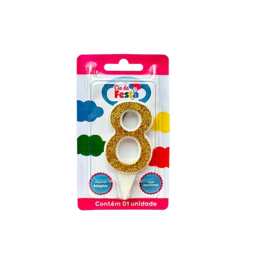 Vela Estilosa Ouro Nº8 Cia da Festa. Celebre cada comemoração com um toque mais sofisticado usando a vela Estilosa! Disponível em números que brilham com glitter, esta vela realça qualquer bolo com seu design elegante e cor chamativa. Seu pavio especial cria o efeito de estrelinhas (faíscas) e tem a magia de se reacender ao ser assoprado. Surpreenda seus convidados com um espetáculo de luz e brilho em cada aniversário, tornando seus momentos especiais ainda mais memoráveis com a vela Estilosa da Cia da Festa!
