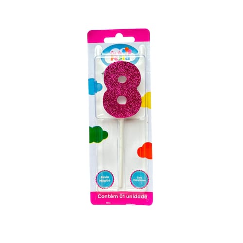 Vela Glamour Rosa Nº8 Cia da Festa. Celebre cada comemoração com um toque de elegância usando a vela Glamour! Disponível em números que brilham intensamente com glitter, esta vela realça qualquer bolo com seu brilho encantador. Equipada com um palito longo para fácil fixação, seu pavio especial cria o efeito de estrelinhas (faíscas) e tem a magia de se reacender ao ser assoprado. Surpreenda seus convidados com um espetáculo de luz e brilho em cada aniversário, tornando seus momentos especiais ainda mais memoráveis com a vela Glamour da Cia da Festa!