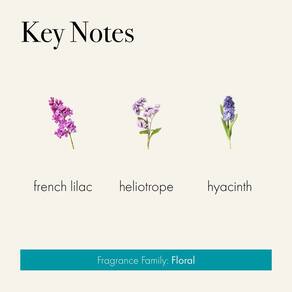 - Aroma: o lilás francês é envolto em um buquê puro de jasmim e jacinto, suavizado por espinheiro, heliotrópio e verduras exuberantes. Este aroma delicado revela um mergulho inspirado na piscina.