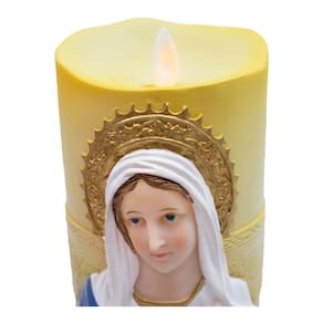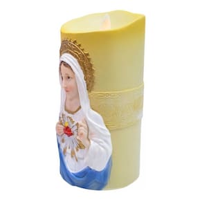 Vela artificial de 17.5 cm de altura formato cilíndrico com imagem de Sagrado Coração de Maria. Luz laranja fogo, após ligado o enfeite vai parecer uma vela em chamas. Material: resina; Funcionamento: 2 pilhas AA Código A350432-E Peso Kg 0.35 Altura cm 17.50 Largura cm 8.00 Comprimento cm