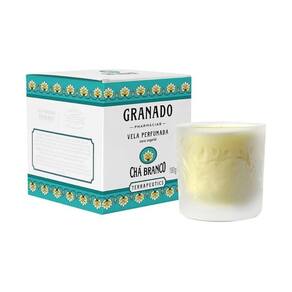 Vela Perfumada Granado Terrapeutics Chá Branco 180g feita com notas frescas de chá branco, bebida milenar chinesa valorizada por suas propriedades antioxidantes e revigorantes. Produzida com cera de carnaúba, promove duração prolongada e não libera fumaça preta no ambiente.