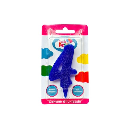 Vela Premium Azul Nº4 Cia da Festa. Celebre cada comemoração com um toque mais sofisticado usando a vela Premium! Disponível em números que brilham com glitter, esta vela realça qualquer bolo com seu design chamativo. Seu pavio especial cria o efeito de estrelinhas (faíscas) e tem a magia de se reacender ao ser assoprado. Surpreenda seus convidados com um espetáculo de luz e brilho em cada aniversário, tornando seus momentos especiais ainda mais memoráveis com a vela Premium da Cia da Festa!