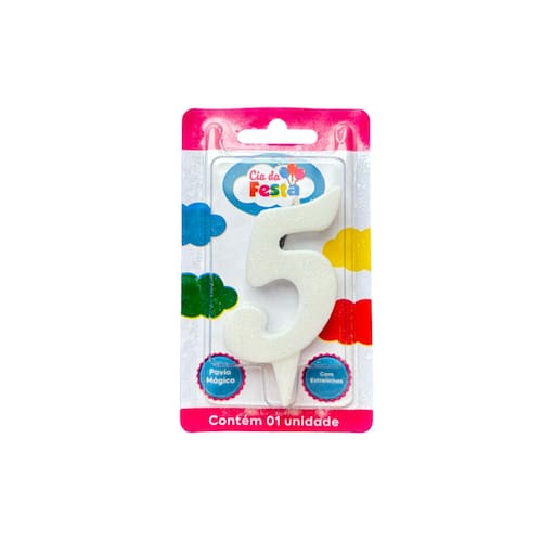 Vela Premium Branca Nº5 Cia da Festa. Celebre cada comemoração com um toque mais sofisticado usando a vela Premium! Disponível em números que brilham com glitter, esta vela realça qualquer bolo com seu design chamativo. Seu pavio especial cria o efeito de estrelinhas (faíscas) e tem a magia de se reacender ao ser assoprado. Surpreenda seus convidados com um espetáculo de luz e brilho em cada aniversário, tornando seus momentos especiais ainda mais memoráveis com a vela Premium da Cia da Festa!