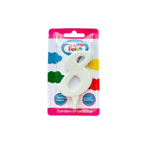 Vela Premium Branca Nº8 Cia da Festa. Celebre cada comemoração com um toque mais sofisticado usando a vela Premium! Disponível em números que brilham com glitter, esta vela realça qualquer bolo com seu design chamativo. Seu pavio especial cria o efeito de estrelinhas (faíscas) e tem a magia de se reacender ao ser assoprado. Surpreenda seus convidados com um espetáculo de luz e brilho em cada aniversário, tornando seus momentos especiais ainda mais memoráveis com a vela Premium da Cia da Festa!