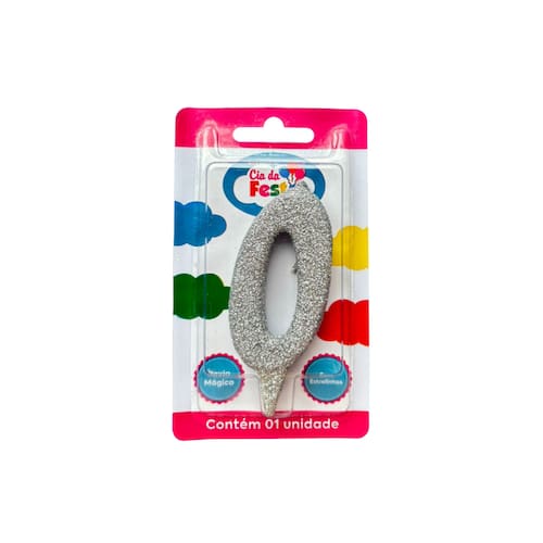 Vela Premium Glitter Prata Nº0 Cia da Festa. Celebre cada comemoração com um toque mais sofisticado usando a vela Premium! Disponível em números que brilham intensamente com glitter, esta vela realça qualquer bolo com seu design e cor chamativos. Seu pavio especial cria o efeito de estrelinhas (faíscas) e tem a magia de se reacender ao ser assoprado. Surpreenda seus convidados com um espetáculo de luz e brilho em cada aniversário, tornando seus momentos especiais ainda mais memoráveis com a vela Premium da Cia da Festa!