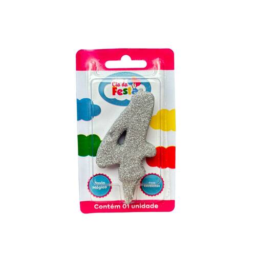 Vela Premium Glitter Prata Nº4 Cia da Festa. Celebre cada comemoração com um toque mais sofisticado usando a vela Premium! Disponível em números que brilham intensamente com glitter, esta vela realça qualquer bolo com seu design e cor chamativos. Seu pavio especial cria o efeito de estrelinhas (faíscas) e tem a magia de se reacender ao ser assoprado. Surpreenda seus convidados com um espetáculo de luz e brilho em cada aniversário, tornando seus momentos especiais ainda mais memoráveis com a vela Premium da Cia da Festa!