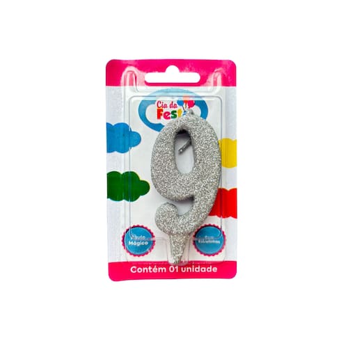 Vela Premium Glitter Prata Nº9 Cia da Festa. Celebre cada comemoração com um toque mais sofisticado usando a vela Premium! Disponível em números que brilham intensamente com glitter, esta vela realça qualquer bolo com seu design e cor chamativos. Seu pavio especial cria o efeito de estrelinhas (faíscas) e tem a magia de se reacender ao ser assoprado. Surpreenda seus convidados com um espetáculo de luz e brilho em cada aniversário, tornando seus momentos especiais ainda mais memoráveis com a vela Premium da Cia da Festa!