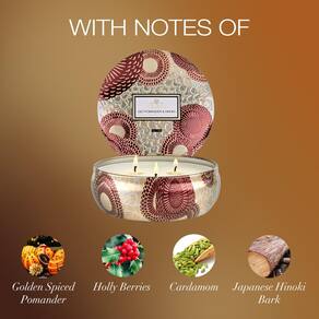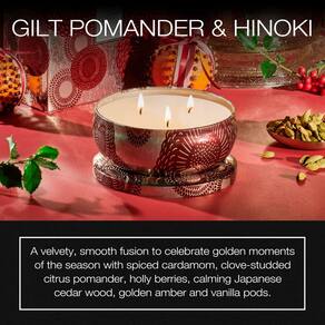 Esta vela Voluspa Gilt Pomander Hinoki foi criada para elevar qualquer ambiente com sua aparência sofisticada e fragrância convidativa. Envolvida em uma linda lata metálica com padrão adornado por tons profundos de joias, serve tanto como peça decorativa quanto fonte de uma atmosfera acolhedora. A vela é feita com uma mistura exclusiva de cera de coco, que promove uma queima limpa e ambientalmente amigável, minimizando fuligem e toxinas.