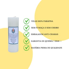 Vela Votiva de 7 Dias 100% Parafina - Fabricação Própria. Contém 1 unidade.Cor: Amarela e Verde. Peso: 260 gramas. Altura: 15 cm. Diâmetro: 50 mm. Composição: Parafina, Corante e Pavio. Validade: Indeterminada. Marca: SAGRADA VELA. *Atenção: Plástico Anti-Chamas, NÃO retirar para acender. *Segurança: evite acidentes, utilize sempre um castiçal ou suporte próprio para velas. *Duração: 7 dias. As condições de queima podem alterar conforme o ambiente ou corrente de ar, portanto é indicado acender em local arejado e longe do alcance de crianças, animais domésticos e produtos inflamáveis. Como se trata de um produto artesanal, podem existir pequenas variações nas cores das velas. Embalamos cuidadosamente para o transporte. Imagem meramente ilustrativa. Marca: Não Informado