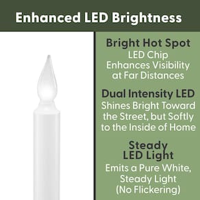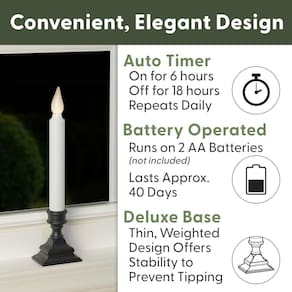 O brilho das velas na janela é uma tradição atemporal. No entanto, como muitos consumidores trocaram as velas elétricas pelas que funcionam com bateria, eles ficaram com resultados menos do que desejáveis. No 612 Vermont, nossa vela da série 1506 tenta resolver todos os seus problemas! Nosso ponto de acesso de LED branco brilhante brilha fortemente na parte externa de sua casa, embora seja bastante silencioso por dentro para evitar que distraia enquanto você está em casa. A luz branca pura fornece o que a maioria dos usuários prefere em vez de uma luz amarelo/laranja. Também não poupamos nenhuma despesa com nossa base. Nossa base moldada sob medida oferece uma aparência elegante a toda a vela enquanto ela fica no parapeito da janela o dia todo. Se você estava preocupado com a possibilidade de ela tombar, não se preocupe, pois adicionamos um peso à base para evitar que ela tombe. A operação é bastante fácil, basta inserir 2 pilhas AA por vela (não incluídas) no castiçal e apertar a cavidade com a tampa de rosca. O cronômetro automático iniciará na posição ligada quando a cavidade estiver segura e permanecerá acesa por 6 horas, nas quais o cronômetro da vela desligará pelas próximas 18 horas e depois se repetirá diariamente. A função de temporizador fornece um tempo consistente para as velas acenderem, independentemente da luz ambiente dentro ou fora de casa. As baterias fornecerão aproximadamente 40 dias de vida com brilho ideal. Somente para uso interno. Vendido em um pacote de 4. Escolha entre uma cor base antiga (preta) ou estanho (prata).