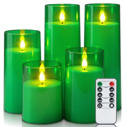 Homemory Conjunto de 5 velas sem chama, verde - Efeitos de velas realistas: estas velas verdes sem chama Homemory são vívidas como velas reais quando cintilam nas conchas de acrílico transparente, adequadas para decoração de casa, festas, festivais, feriados e dia de São Patrício. - Conchas transparentes inquebráveis: em comparação com o vidro frágil tradicional, as velas falsas de acrílico Homemory são mais fortes e mais leves, sem qualquer preocupação de quebrá-las ou derreter sob luz solar direta. - Opções de controle remoto convenientes: ligue ou desligue facilmente as velas da bateria, defina o temporizador, ajuste os modos de luz, brilho com o controle remoto de 10 teclas. Depois de definir o temporizador, eles funcionarão automaticamente em um ciclo de 24 horas. - Segurança em primeiro lugar: não se preocupe com fumaça, chama e cera pingando, estas velas operadas por bateria são amigáveis para crianças e animais de estimação. Aproveite o ótimo ambiente com tranquilidade, não precisa se preocupar com as velas serem sopradas pelo vento. - O pacote inclui: Este conjunto de velas sem chama inclui 5 velas LED verdes (7 x 10 cm, 15 cm, 20 cm), 2 controles remotos e um manual do usuário. Cada vela operada por bateria é alimentada por 2 pilhas AA (não incluídas) que duram mais de 500 horas.