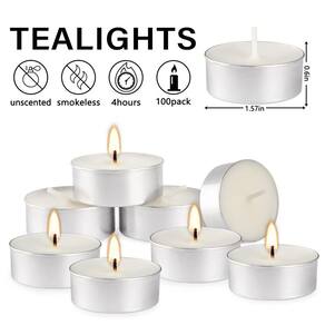 - Tamanho: cada vela Tea Light mede 1,5 polegadas L x 0,65 polegadas H e queima por quatro horas sem fumaça preta ou confusão ca pelo gotejamento de velas