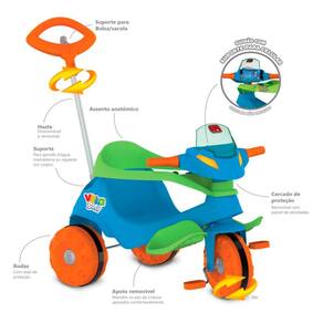 Características: Função Passeio: O adulto utiliza a haste direcionável para conduzir o triciclo. Basta, colocar o cercado de proteção e o apoio dos pés. Função Pedal: Permite à criança pedalar livremente como um triciclo convencional. Basta remover a haste, o cercado de proteção e o apoio dos pés. Haste direcionável e removível. Rodas com anel antiderrapante. Assento anatômico. Suporte para garrafa dágua, mamadeira ou squeeze -no corpo do produto-. Apoio para os pés removível: Mantém os pés da criança apoiados confortavelmente. Suporte para bolsa/ sacola -na alça da haste-. Guidão com porta celular. Cercado de proteção removível com painel de atividades. Idade: +12 meses. Peso máximo suportado: 30kg. Número do registro : 003834/2021 OCP:0061