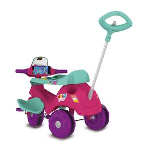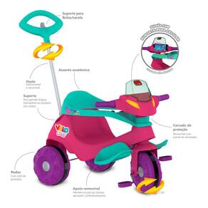 Caracteristicas: Função passeio: O adulto utiliza a haste direcionável para conduzir o triciclo. Basta, colocar o cercado de proteção e o apoio dos pés. Função pedal: Permite à criança pedalar livremente como um triciclo convencional. Basta remover a haste, o cercado de proteção e o apoio dos pés.