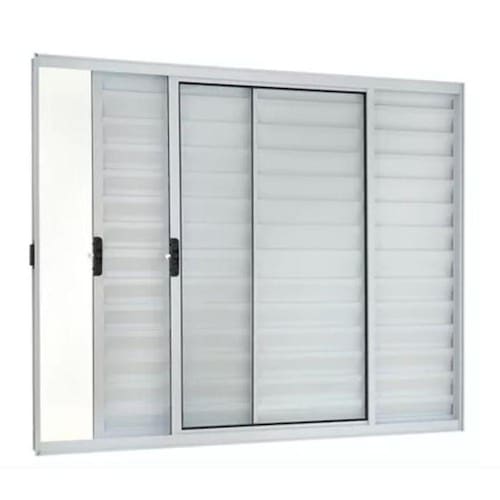 Veneziana 100x150 3 Folhas – Alumínio Branco – Linha 18 Modular Janela do tipo Veneziana com 1 folha veneziana fixa e 1 folha veneziana móvel (de correr) + 1 folha de vidro móvel (de correr). Fecho na lateral. Já vem com vidro incluso e pronta para instalar. Não enferruja. De fabricação própria.
