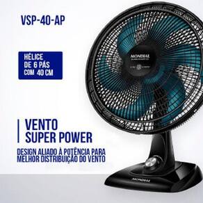 Vent 40Cm Mondial Super Power Vsp-40-Ap - 4412-02 Preto/Azul 220 Volts MarcaMondialModeloSuper Power- VSP-40-APTipoVentilador de mesaDiâmetro40 cmPás6 pásVelocidades3 velocidadesAcionamentoManualNível de ruídoBaixoRepelenteNãoLumináriaNãoTimerNãoPotência140 WAltura62,5 cmLargura45 cmProfundidade32 cmPeso2,45 kgCódigo de barras110V: 7899882314236 | 220V: 7899882314243Garantia01 ano 3 meses de garantia legal e mais 9 meses de garantia especial concedida pelo fabricante . Conteúdo da embalagem01 Ventilador e manual de instruções